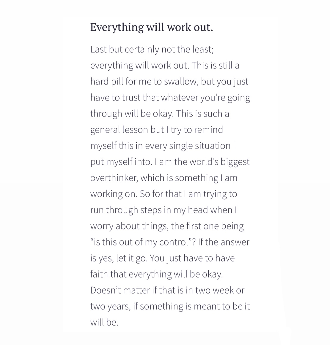 Last but certainly not the least; everything will work out. This is still a hard pill for me to swallow, but you just have to trust that whatever you’re going through will be okay. This is such a general lesson but I try to remind myself this in every single situation I put myself into. I am the world’s biggest overthinker, which is something I am working on. So for that I am trying to run through steps in my head when I worry about things, the first one being “is this out of my control”? If the answer is yes, let it go. You just have to have faith that everything will be okay. Doesn’t matter if that is in two week or two years, if something is meant to be it will be.
